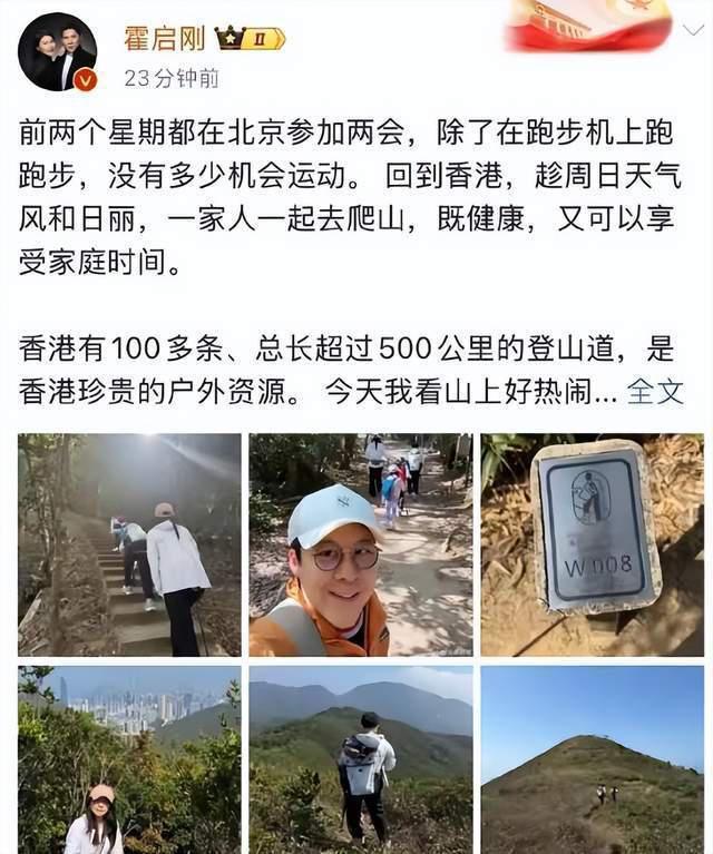 据悉,霍启刚此前两周因参加两会事务身在北京,他透露期间 " 除了在跑步机上跑跑步,没有多少机会运动 "。返回香港后,他立即策划了这场家庭登山活动,既为锻炼身体,也为珍惜难得的家庭相聚时刻。照片中,霍启刚身穿橙色外套、头戴蓝色棒球帽,主动走在队伍最后方,全程担任 " 守护者 " 与摄影师,用镜头记录家人的身影。