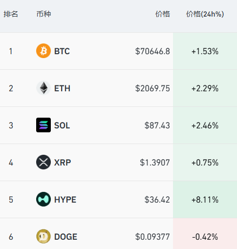加密货币主要币种普涨,比特币涨超1.5%,重返7万美元。过去24小时,全市场超9万人爆仓。